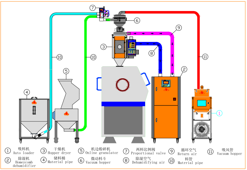 機臺的主要用途是與熱風式料斗干燥機搭配,對吸濕性較強的工程塑料